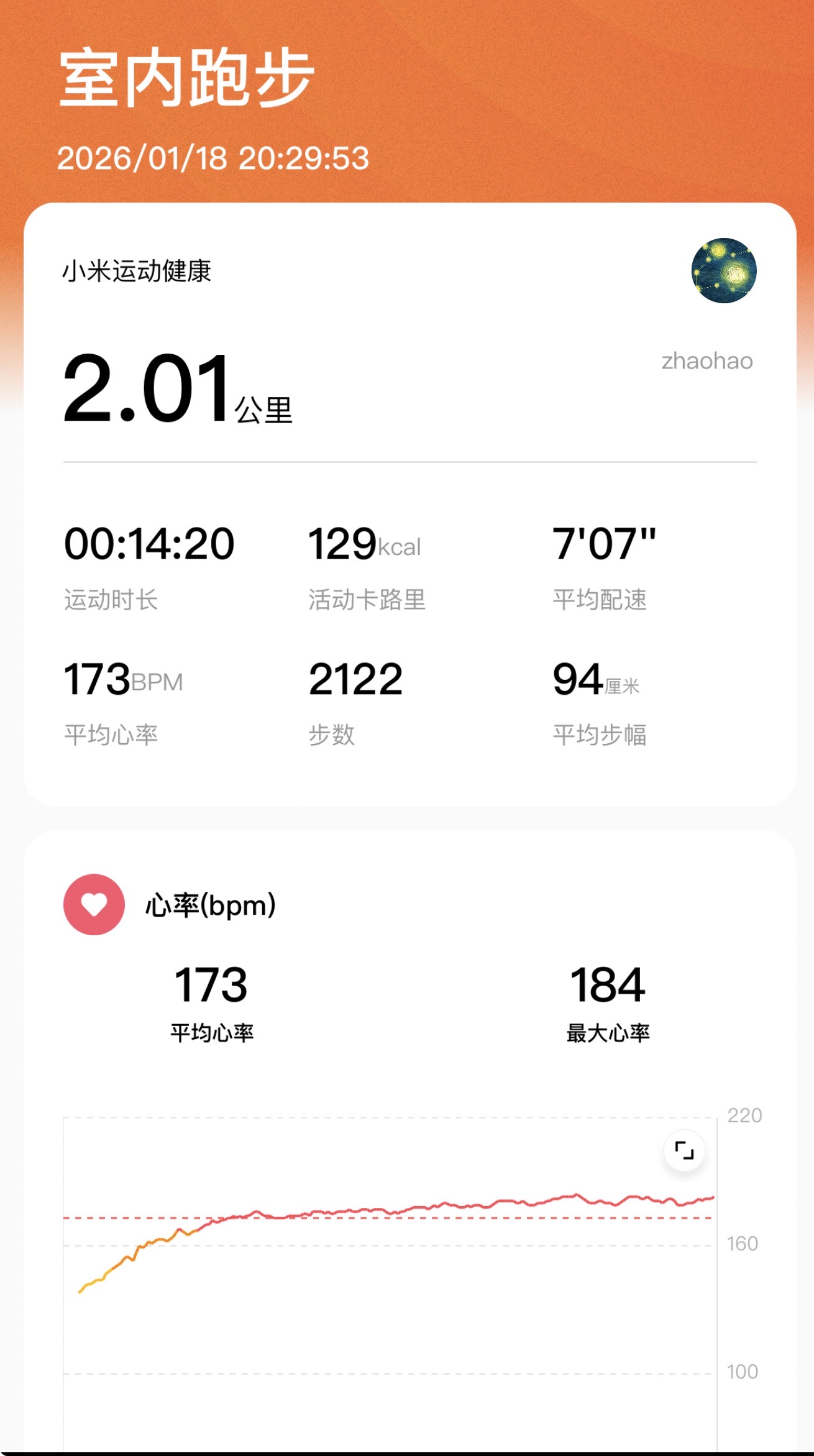 今天提高了点速度,速度开始就设置到了8km/h,跑了三公里,心率又开始往170靠上了,为了控制心率停了一会儿休息。这三公里平均配速7分43秒,平均心率157。